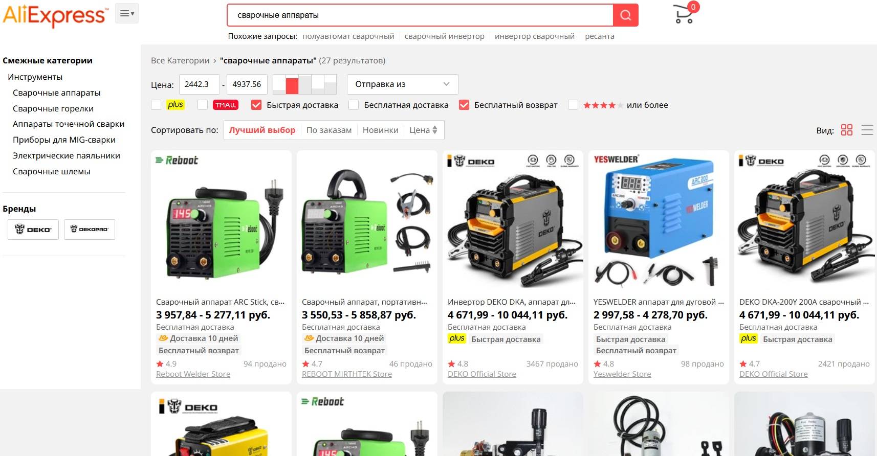 Чтобы найти сварочный аппарат на AliExpress, а также аксессуары для сварки, достаточно ввести ключевое слово в строку поиска (рис 1) и задать требуемые параметры (рис 2).