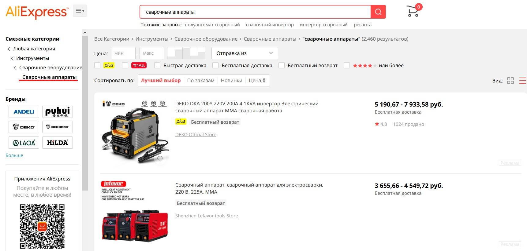 Для выбора сварочного аппарата или аксессуаров для сварки требуется ввести ключевое слово в строку поиска и задать сортировку по нужным параметрам. Например, товары с отметкой SALE, бесплатной доставкой, оценками более 4 звёзд. Чтобы отсеять ненужные значения, нужно выбрать в левом столбце «сварочные аппараты» (рис 3).