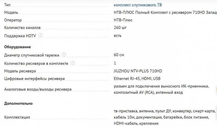 Технические характеристики комплекто спутникового телевидения НТВ+Источник dns-shop.ru