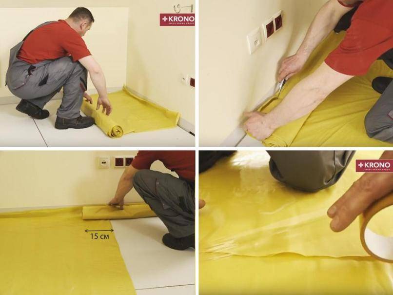 Первую полосу подложки укладывают вдоль той стены, от которой начнется монтаж ламината, причем на всю длину комнаты. Не нужно раскладывать следующую часть материала, пока первая не будет застелена ламинированным настилом: указанный прием защитит ее от повреждений. По мере необходимости нужно постелить следующий лист. Указанная рекомендация относится и к гидроизоляции из полиэтилена, по которой также не следует ходить в уличной обуви, чтобы не повредить. Соседние полотна подложки плотно совмещают и скрепляют скотчем.
