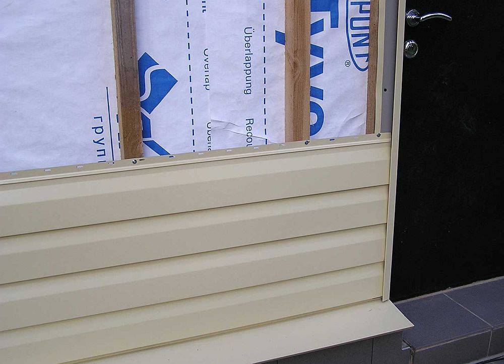 Укладка ветрозащитной пленки и установка каркаса под укладку сайдинга Далее к подготовленной поверхности крепят ветропароизоляционную пленку, после чего монтируют обрешетку. Технология укладки сайдинга может подразумевать монтаж обрешетки как из деревянных брусьев, так и из алюминиевого профиля. Второй вариант при этом будет более предпочтителен. Обрешетка укладывается вертикально или горизонтально в зависимости от способа монтажа панелей облицовки. Если укладка наружного сайдинга будет производиться горизонтально, то обрешетка должна быть вертикальной, и наоборот. Если есть необходимость в утеплении здания, в пространство между планками обрешетки укладывают теплоизоляционный материал – пенопласт или плиты минеральной ваты. Утеплитель прикрепляется к фасаду клеевым способом в комбинации с установкой грибообразных дюбелей.