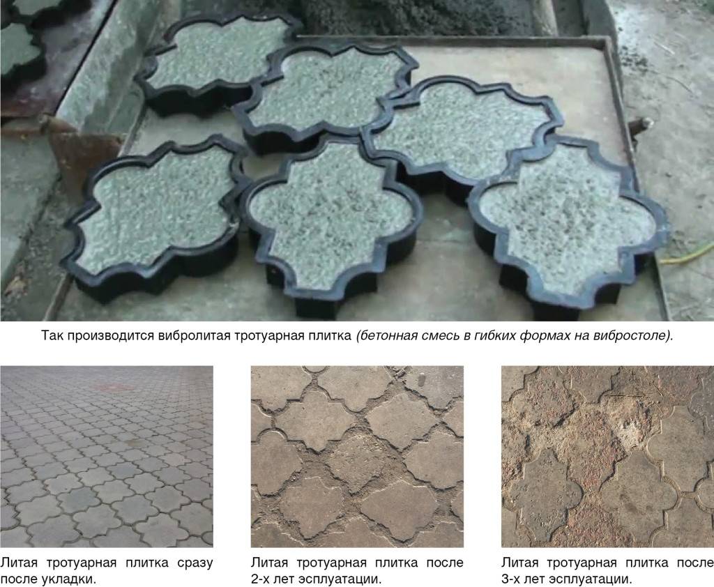 Определяющее значение имеет, каким способом была изготовлена плитка – вибролитье или вибропрессование. Плитка кустарного производства, выполненная путем вибролитья – менее устойчива и быстрее изнашивается, а промышленная (вибропрессованная) прослужит порядка 100 лет.