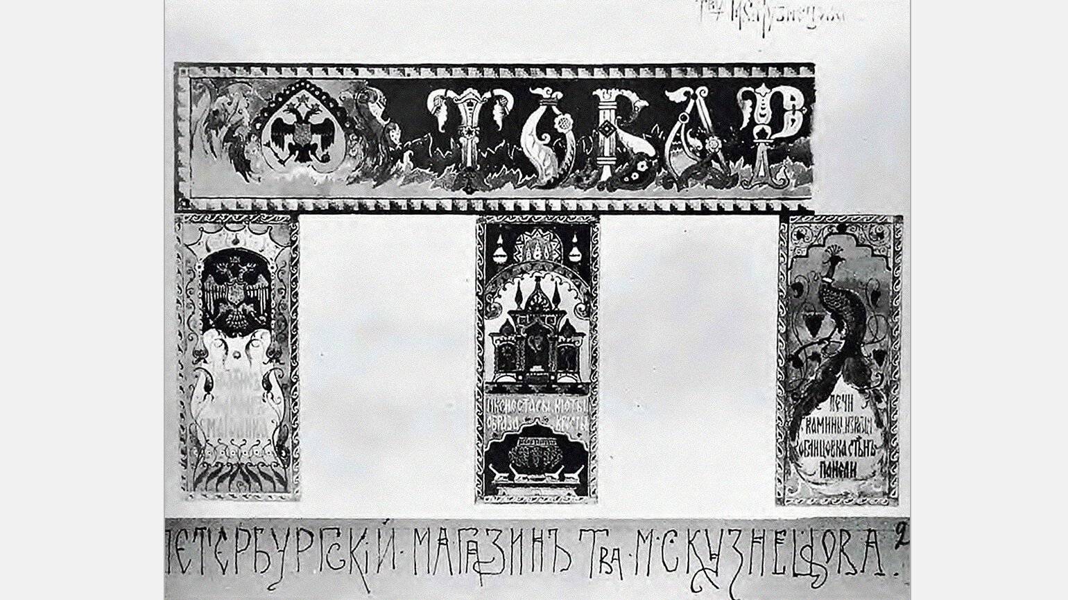 Проект отделки фасада магазина товарищества М. С. Кузнецова в Санкт-Петербурге. Архитектор Ф. О. Шехтель. 1890-е годы. Изображение: Кириченко, Щеболева, Нащокина. «Градостроительство России середины XIX — начала ХХ века. Том II. Города и новые типы поселений» / издательство «Прогресс-Традиция»