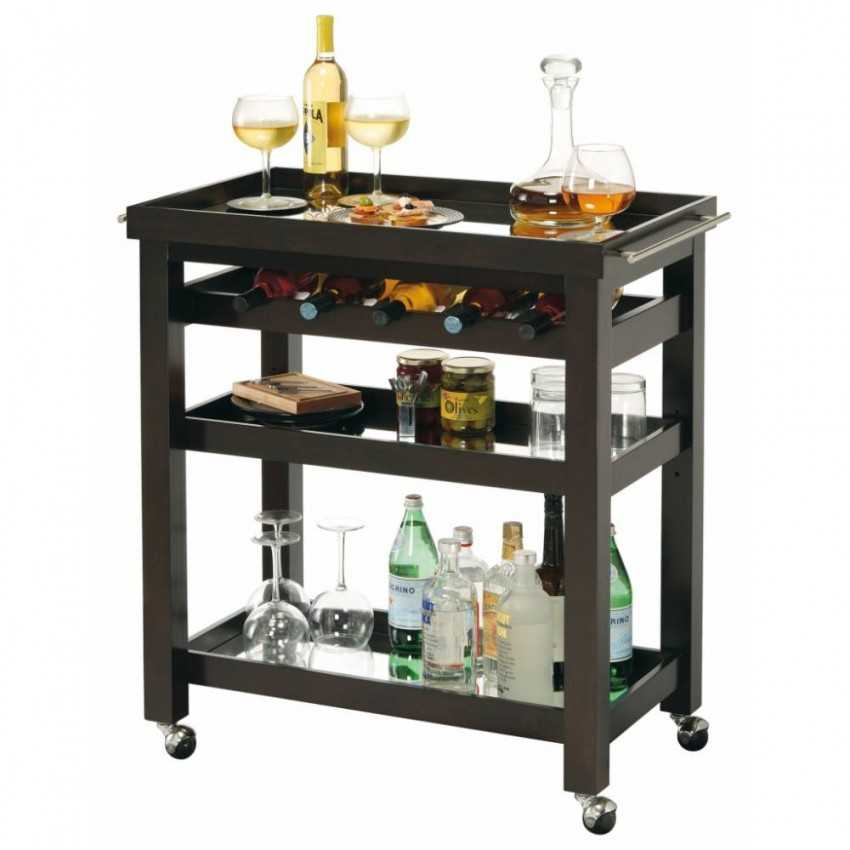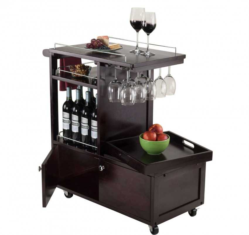 Одной из разновидностей мини-бара является модификация с тележкой. По сути это простая тележка, у которой есть верхняя часть с бортиками – первая полка, и вторая полка, которая находиться немного ниже, но тоже с бортиками.