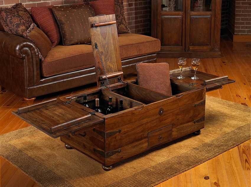 - изюминка в интерьере – скрытый предмет мебели, в котором можно безопасно хранить спиртные напитки;