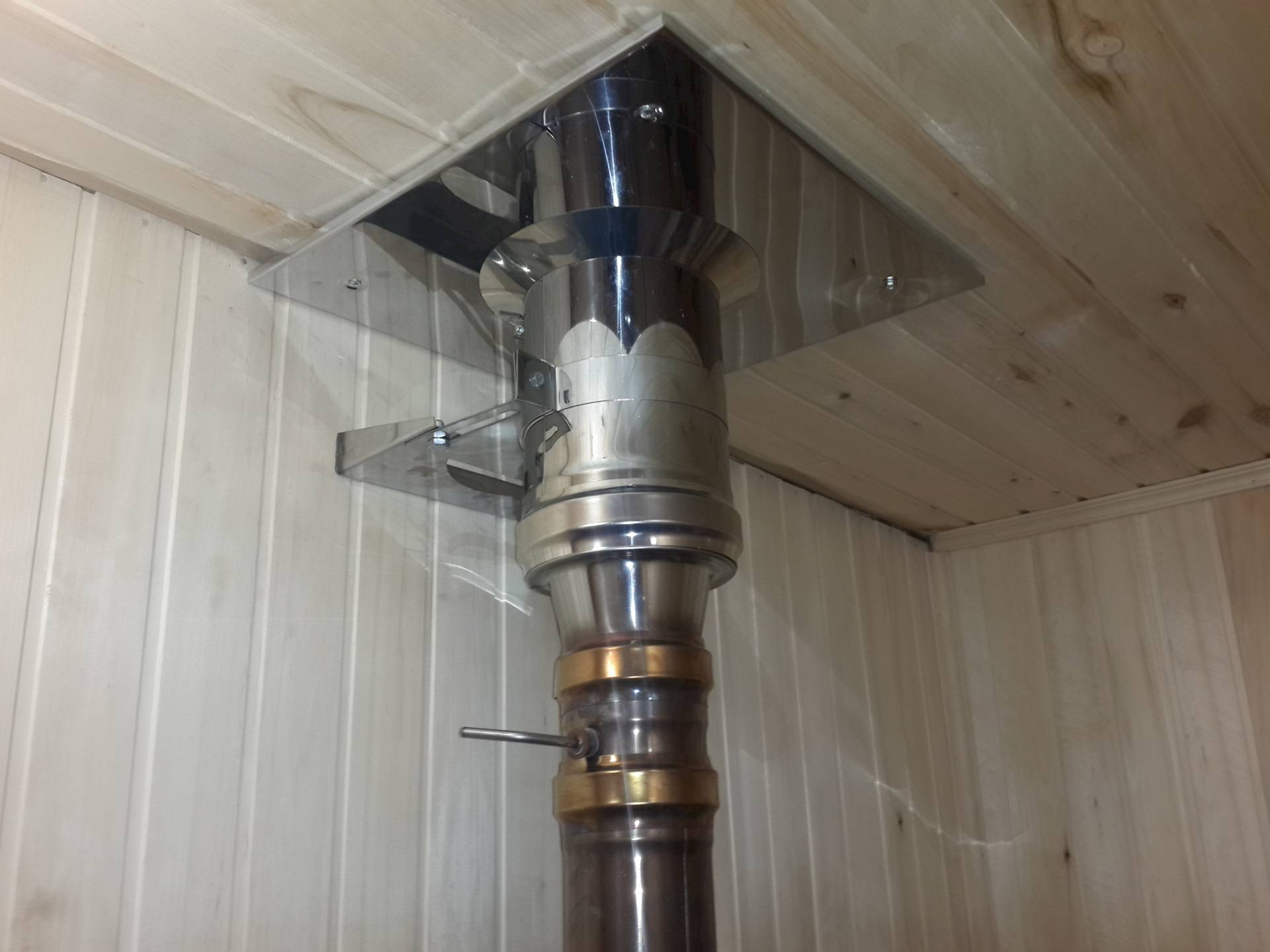- Не допускается состыковка дымовых модулей в плоскости перекрытия и кровле. Места сочленений должны быть доступны визуальному контролю. Например, при прохождении трубы через потолок в парилке, нижняя ее часть должна быть в парной, а верхняя – на чердаке или мансардном этаже.