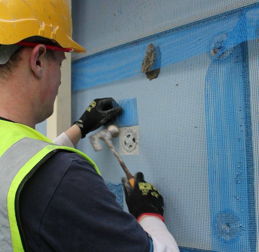 - Армирующая сетка уложена в базовый слой штукатурки.