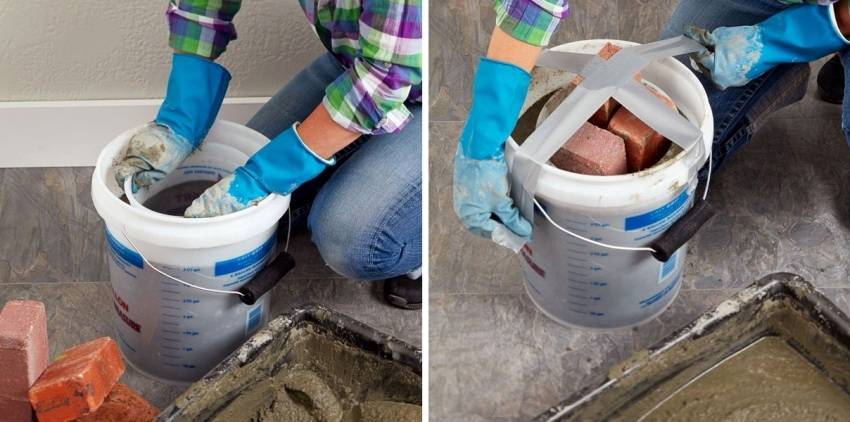 После этого вам необходимо подготовить емкость, которую вы будете заливать бетоном, и гнет, который вы будете ставить внутрь емкости, чтобы получился вместительный вазон. В качестве емкости можно брать старый тазик, ведро, пластиковый контейнер, а в качестве гнета — камни или же песок в большом количестве.