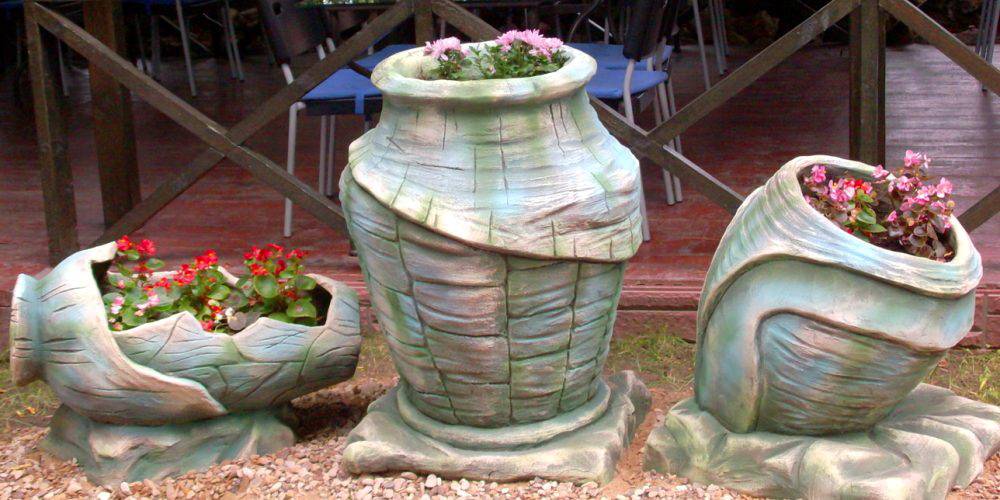 - гипс или бетон. Данные материалы довольно простые в работе и не слишком дорогие. Что касается их технических качеств, то к ним стоит отнести: долговечность, практичность, износостойкость, устойчивость к негативным факторам окружающей среды. Вазоны из цемента своими руками для сада изготавливаются любых форм и дизайнов. Единственное, вес такого горшка будет довольно внушительным. Поэтому их рекомендуется сооружать сразу на том месте, где будут высаживаться растения;