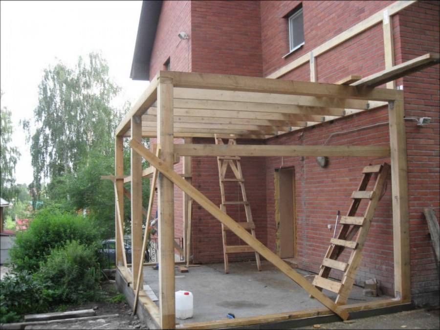 Если ширина веранды больше 2 метров или использоваться будет тяжелый кровельный материал, для того, чтобы опорная балка не провисала, устанавливают распорки. Их лучше не прибивать сбоку, а именно вставлять враспор между потолочной балкой и стропильной ногой.