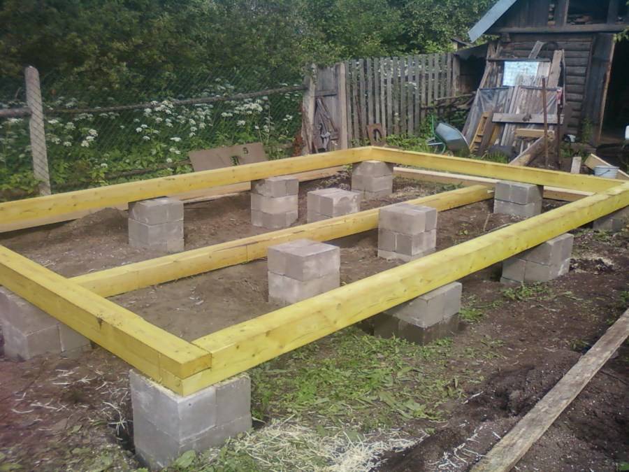 Начинается монтаж каркаса с выполнения нижней обвязки. Для этого на опоры укладывается брус.