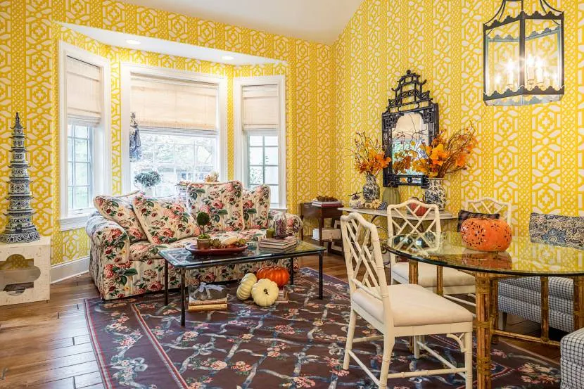 - Количество окон и дверей. Если в гостиной несколько дверных или оконных проемов, лучше предпочесть обои с ненавязчивым орнаментом. Сложный, насыщенный паттерн, перебиваемый оконными и дверными «вставками» способен создать эффект мельтешения, и интерьер будет восприниматься загруженным.