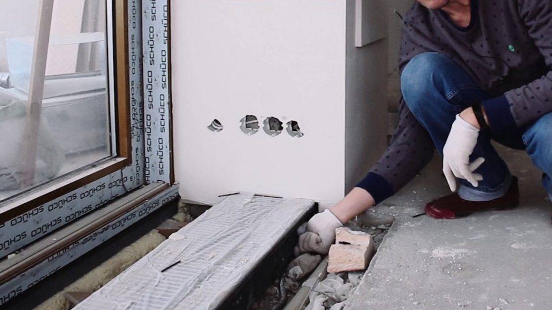 Фиксировать отопительный прибор можно и с помощью монтажной пены, и с помощью цементного раствора