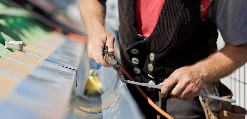 Вырезание отверстия под водосточную воронку и правила раскроя желоба